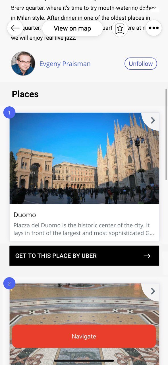 Discover trips and tours around you while finishing your Uber ride. Use Uber to start a tour and enjoy of it's details in Pinsteps app.